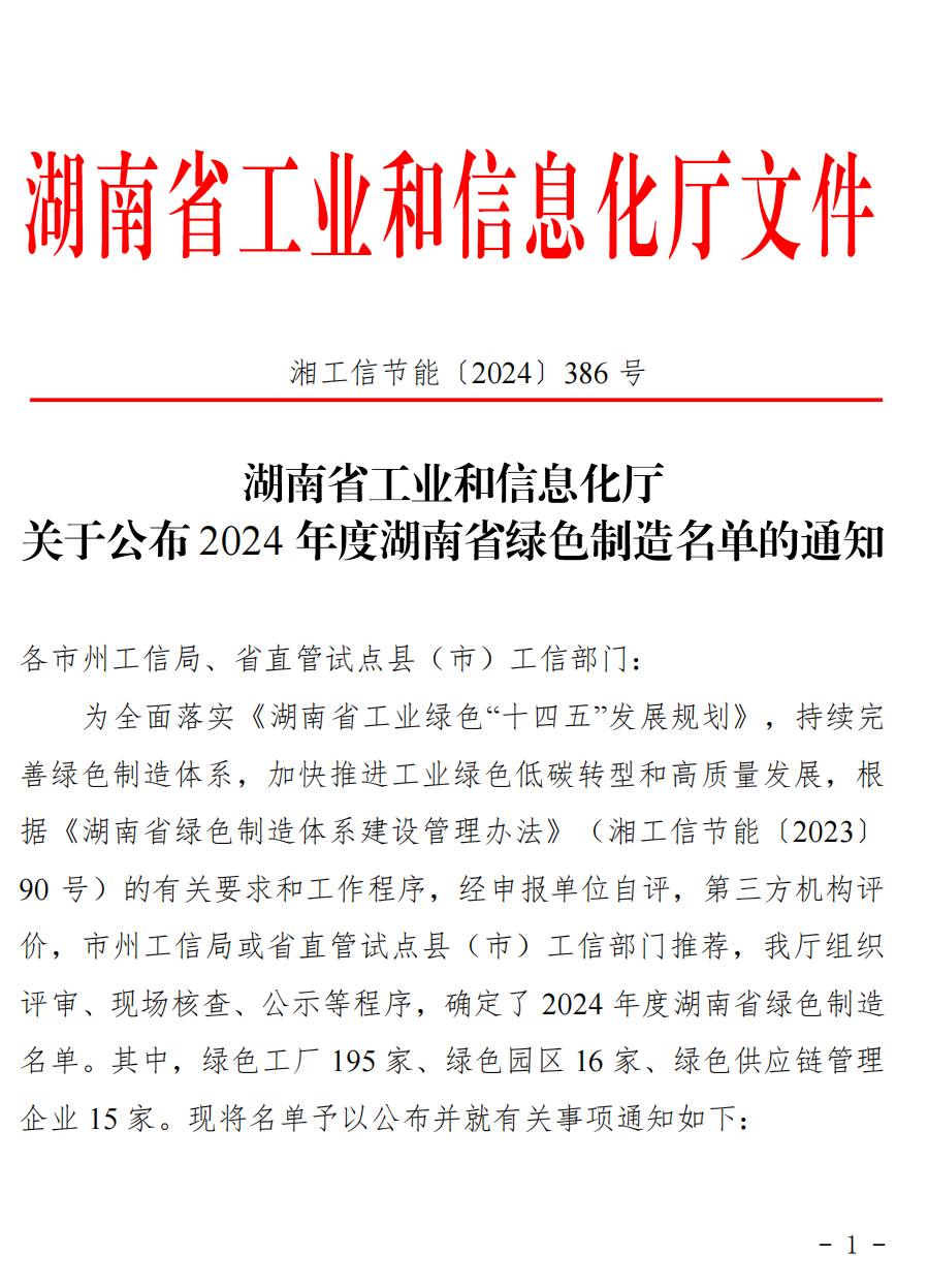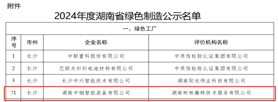 10月10日,湖南省工业和信息化厅发布2024年度湖南省绿色制造名单,湖南中钢智能装备有限公司通过层层筛选,专家评审以及现场考察,在众多申报企业中脱颖而出,成功获批湖南省绿色工厂,这标志着中钢装备在推动绿色制造领域上又迈出了坚实的一步。